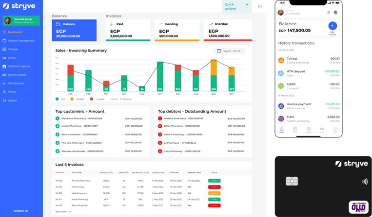وأشار أحمد سمير المؤسس والرئيس التنفيذي لشركة «سترايف Stryve » للتكنولوجيا المالية وخدمات الدفع الإلكتروني إلى أن تطبيق «سترايف Stryve» يوفر حلولا مالية للمتاجر أو الشركات الصغيرة والمتوسطة من خلال بطاقات الدفع المسبق التي تمكنهم من دفع الفواتير للموردين سواء الكاش أو الأجل من خلال تطبيق «سترايف Stryve» باللغتين العربية والإنجليزية وأيضا استقبال الفواتير ثم دفعها عن طريق التطبيق.