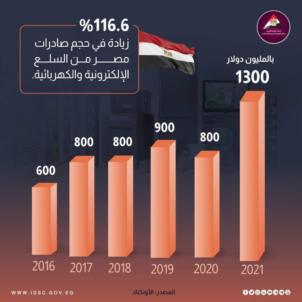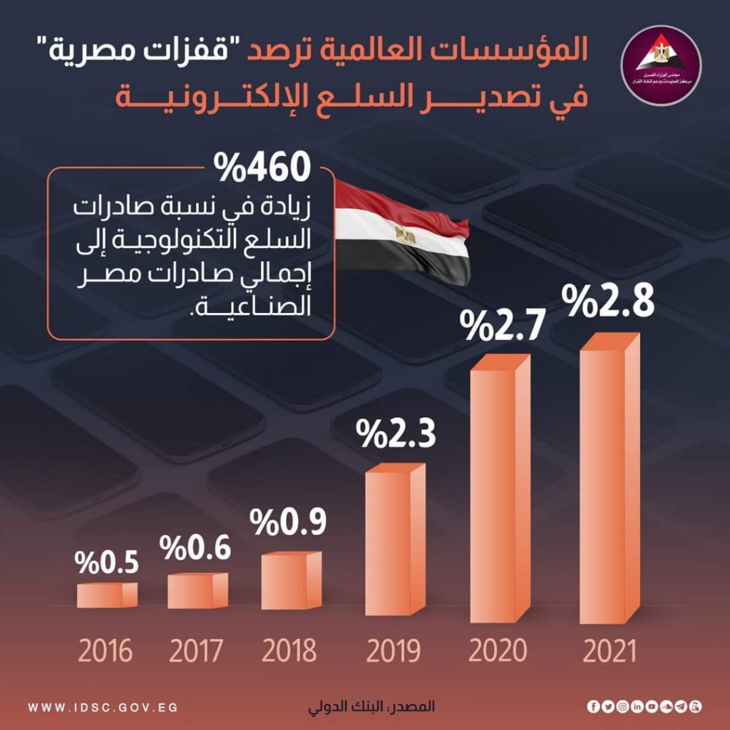 وتحت عنوان: “المؤسسات العالمية ترصد “قفزات مصرية” في تصدير السلع الإلكترونية”، نشر المركز إنفوجرافًا يكشف عن شهادة جديدة من كبرى المؤسسات الدولية حول الخطوات التي اتخذتها مصر لتوطين الصناعات الإلكترونية وعالية التقنية في البلاد، حيث ارتفعت نسبة صادرات السلع التكنولوجية إلى إجمالي صادرات مصر الصناعية بنسبة بلغت 460 % خلال الفترة من 2016 إلى 2021، بجانب تحقيق 116.6 % زيادة في حجم صادرات مصر من السلع الإلكترونية والكهربائية خلال الفترة نفسها، وذلك استنادًا لبيانات البنك الدولي ومنظمة “الأونكتاد”.