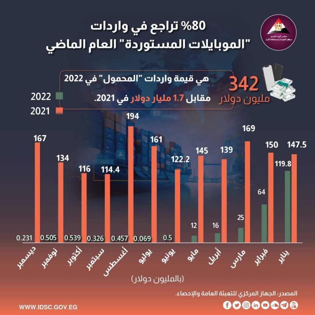** قيمة واردات الهاتف المحمول في 2022 تراجعت لتسجل 342 مليون دولار مقابل 1.7 مليار دولار في 2021 بما يتوازى مع جهود تعميق التصنيع المحلي