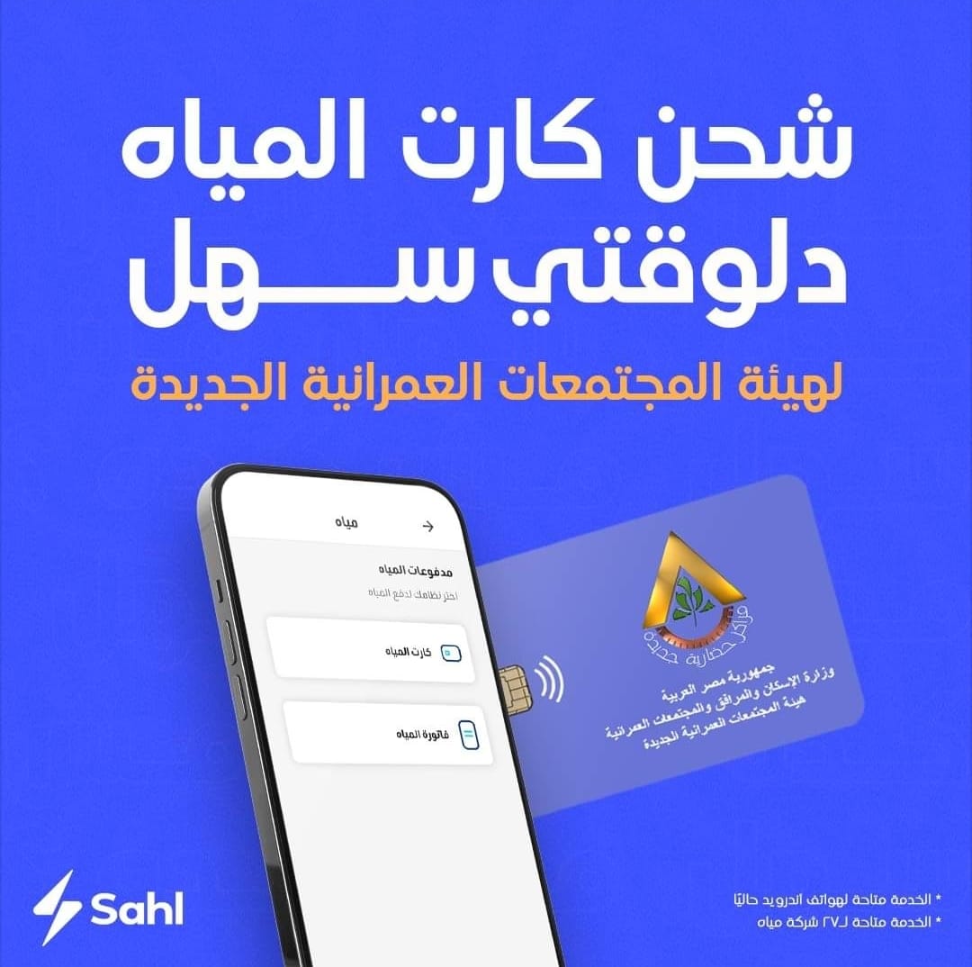 أعلنت شركة سهل المتخصصة في خدمات الدفع والتحصيل الإلكتروني عن إضافة خدمة جديدة على تطبيق سهل من خلال توفير امكانية شحن كارت عداد المياه مسبق الدفع وذلك بالتعاون مع هيئة المجتمعات العمرانية الجديدة.