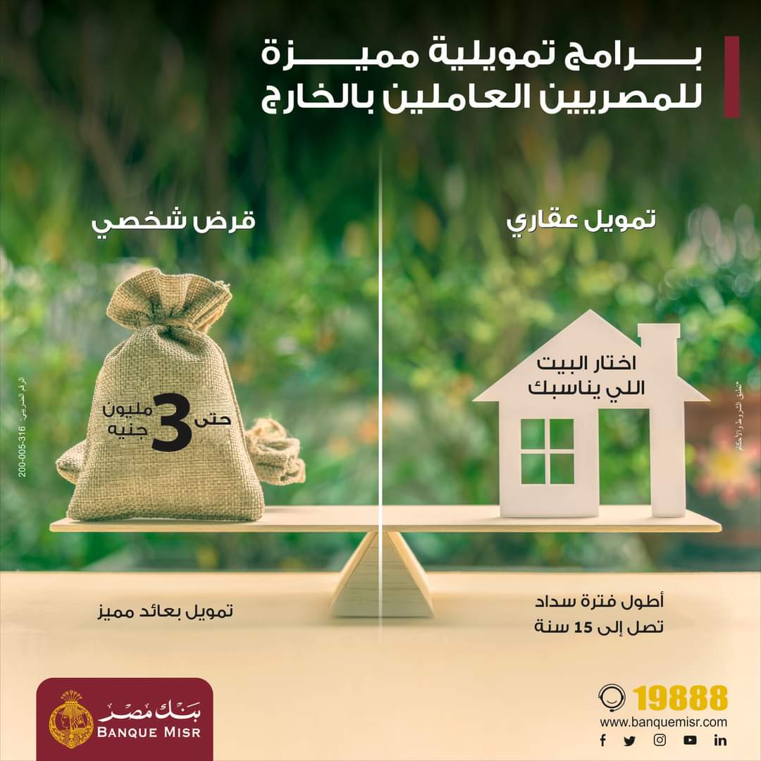 أطلق بنك مصر مؤخرا منتجي القرض الشخصي و التمويل العقاري للمصريين العاملين بالخارج، في إطار سعيه الدائم لإتاحة منتجات البنك المختلفة بمميزات تتناسب مع احتياجاتهم.