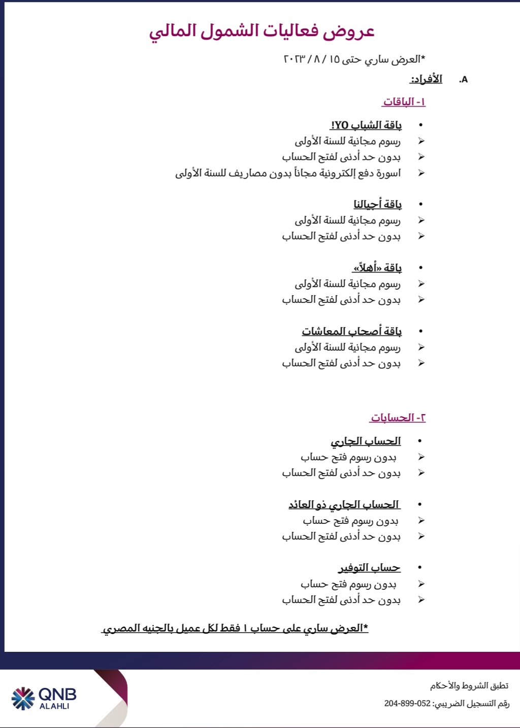 بنك«QNB الأهلى» يتيح فتح حسابات بدون مصاريف أو حد أدنى حتى 15 أغسطس