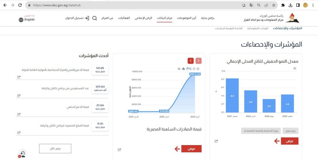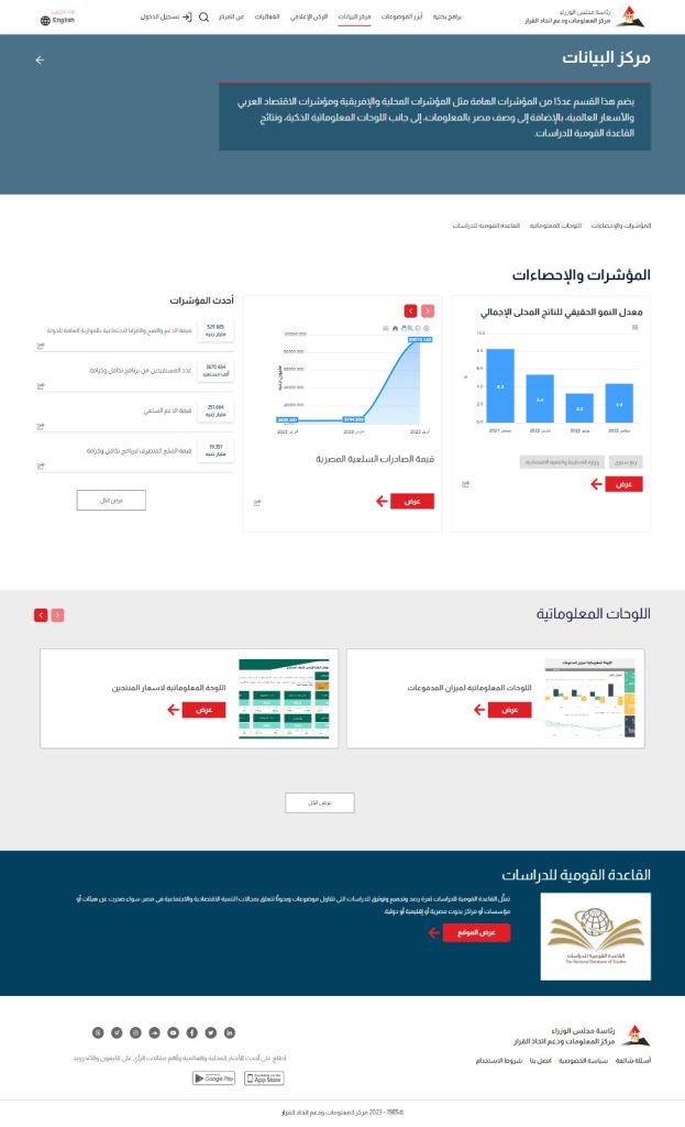 كما ضم الموقع في قسم “مركز البيانات” رابطًا للقاعدة القومية للدراسات، والتي تضم وحدها حوالي 15 ألف دراسة متنوعة، فضلاً عن 138 عنصر بيان من الإحصاءات والمؤشرات التي تمتاز بالشمولية والدقة والاتساق والحداثة، لتغطى كافة مجالات التنمية في مصر، سواء الاقتصادية أو الاجتماعية، حيث يمكن استعراضها في سلاسل زمنية ممتدة قد تفوق الـ 10 سنوات، وذلك بغرض تسهيل حصول المستخدمين على البيانات والمعلومات.