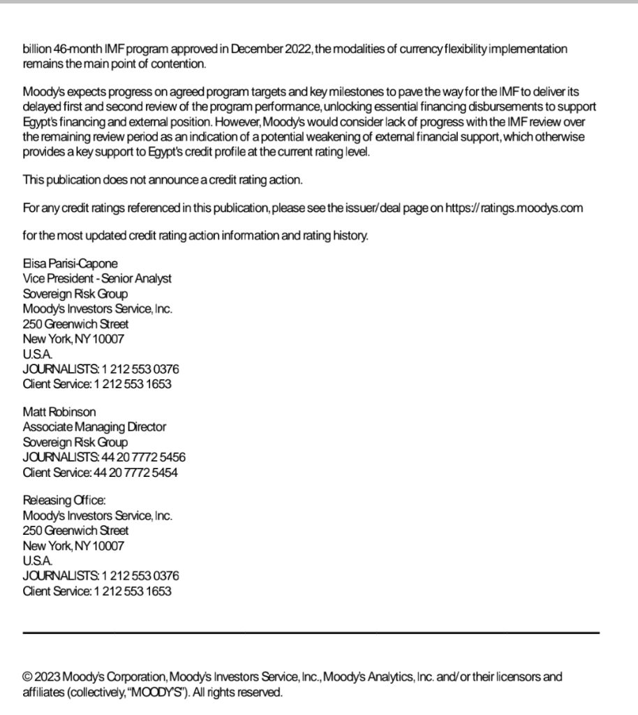 أصدرت مؤسسة موديز للتصنيف الائتماني تقريرا عن مصر قالت فيه أنها سترجئ إصدار تصنيفها للاقتصاد المصري لبعض الوقت مع إحتمالية خفضه.
