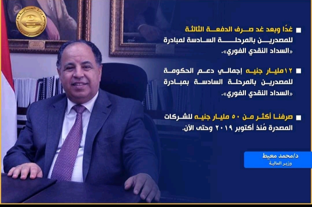 أكد الدكتور محمد معيط وزير المالية، أنه سيتم غدا الأربعاء وبعد غد الخميس، صرف الدفعة الثالثة من المرحلة السادسة من مبادرة «السداد النقدي الفوري» لـ 744شركة مصدرة بإجمالي مساندة تبلغ نحو 4 مليارات جنيه، لتصبح قيمة المساندة عن كامل المرحلة السادسة ما يقرب من 12 مليار جنيه لـ 1558 شركة مصدرة.