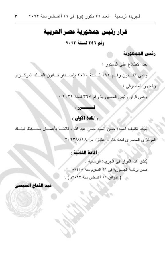 أصدر الرئيس عبد الفتاح السيسي، القرار الجمهوري رقم ٣٤٦ لسنة ٢٠٢٣، بتجديد تكليف حسن عبدالله قائما بأعمال محافظ البنك المركزي لمدة عام، اعتبارا من 18 أغسطس2023.