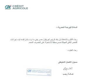 نفى بنك كريدي أجريكول- مصر في بيان ارسل به إلى البورصة المصرية ما تردد عن قيامه بإجراءات الفحص النافي للجهالة للمصرف المتحد.