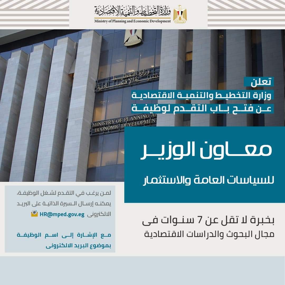 أعلنت وزارة التخطيط والتنمية الاقتصادية المصرية عن فتح باب التقدم لوظيفة معاون الوزير للسياسات العامة والاستثمار بخبرة لا تقل عن 7 سنوات فى مجال البحوث والدراسات الاقتصادية.