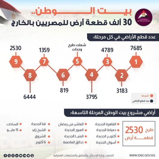 أعلن الدكتور عاصم الجزار، وزير الإسكان والمرافق والمجتمعات العمرانية، تفاصيل المرحلة التاسعة من أراضي مشروع بيت الوطن للمصريين بالخارج، والتي تضم 2530 قطعة أرض بمواقع متميزة بـ14 مدينة جديدة ، والتي بدأ التقديم فيها من الساعة الرابعة عصر يوم الإثنين الموافق 4 سبتمبر 2023، ويتم الحجز بالموقع الإلكتروني الخاص بمشروع “بيت الوطن” للمصريين بالخارج، لـ2530 قطعة أرض يتم طرحها بمواقع متميزة بـ14 مدينة جديدة بالمرحلة التاسعة.