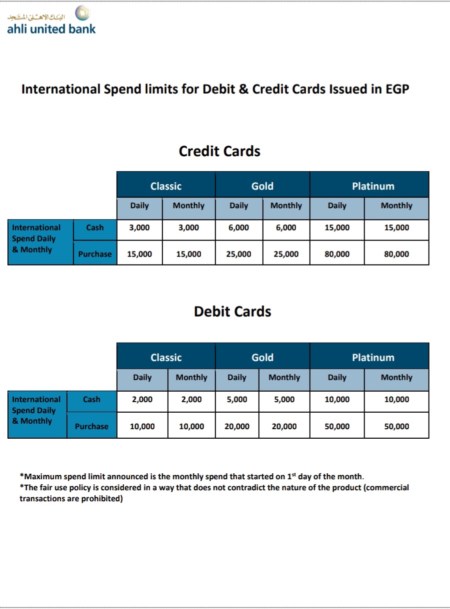 وأشار بالنسبة لبطاقات”Platinum”فإن حد السحب اليومي والشهري يبلغ 10 آلاف جنيه فيما يبلغ حد المشتريات نحو 50 ألف جنيه.