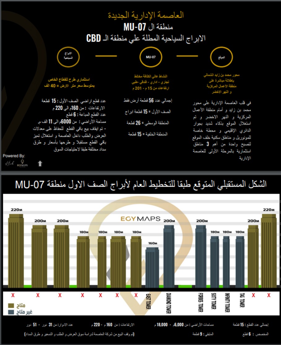 أصدرت شركتي EGY MAPS للمنصات العقاريه الافتراضيه و HUb للاستشارات والتسويق العقاري تقريرا مفصلا حول آخر تطورات مشروعات الابراج بالعاصمة الاداريه الجديده، حيث أوضح التقرير حجم التطور في كافه المراحل الانشائيه لمشروعات الأبراج التي تنفذها شركات التطوير العقاري بمنطقتي الداون تاون ، و ال MU7 داخل مشروع العاصمه الاداريه الجديده.