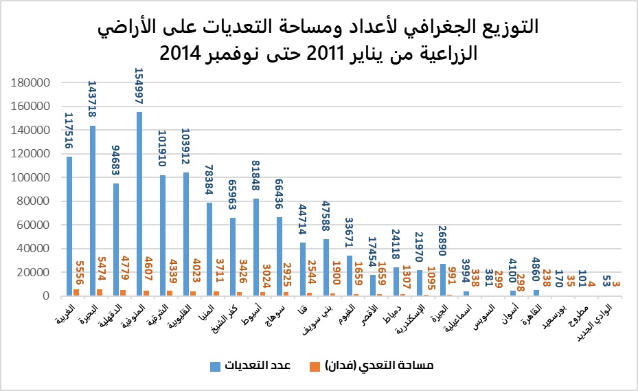 التعدي على الأراضي الزراعية: فخلال الفترة من 25 يناير 2011 حتى يوليو 2019 فقط، تمت قرابة مليوني حالة تعدٍ على الأراضي الزراعية أفقدتنا حوالي 70 ألف فدان. وهو ما خلق بؤرًا عشوائية تفتقر للمرافق والخدمات.