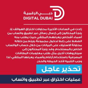 حذرت هيئة دبي الرقمية من عمليات اختراق الهواتف عبر تطبيق “واتساب”، حيث يحاول المتحالون الاستيلاء على البيانات وطلب معلومات البطاقات المصرفية.
