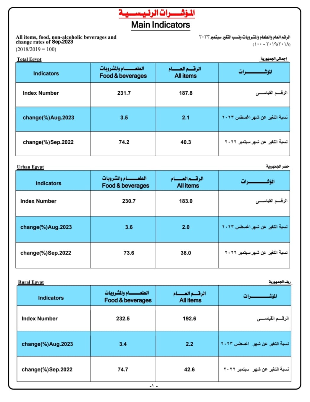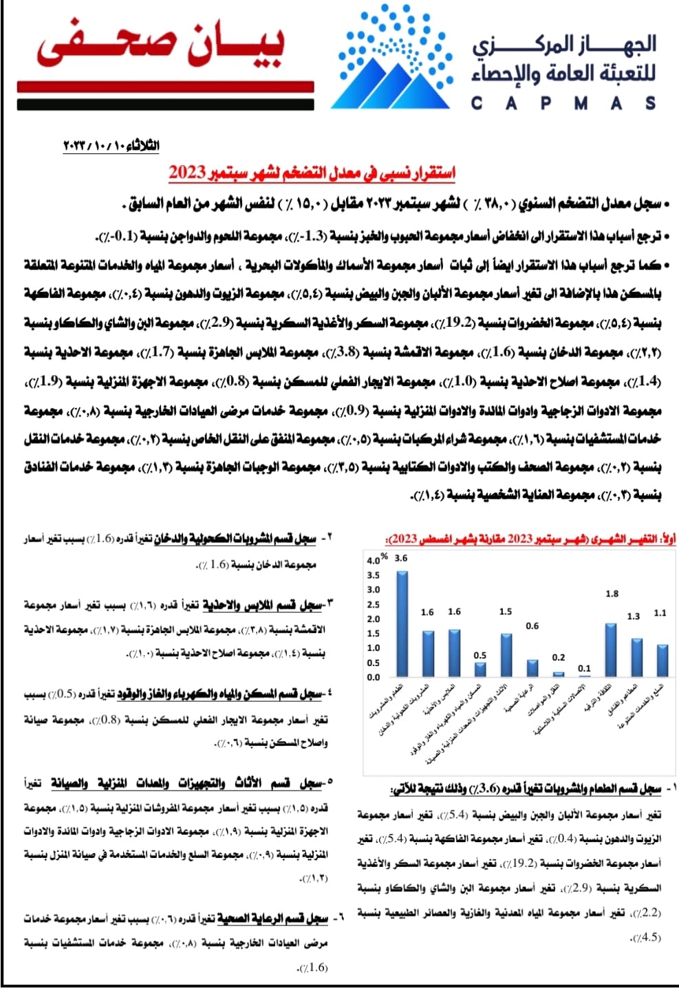 أعلن الجهاز المركزي للتعبئة والأحصاء عن ارتفاع معدل التضـخم السنوي لإجمالي الجمهورية ليبلغ 40.3% لشهر سبتمبر 2023 لأول مرة في تاريخه، مقابل 15.3% لنفس الشهـر من العام السابق وفي المدن إلى 38% في نهاية سبتمبر مقابل 15% في الشهر المماثل من العام الماضي.