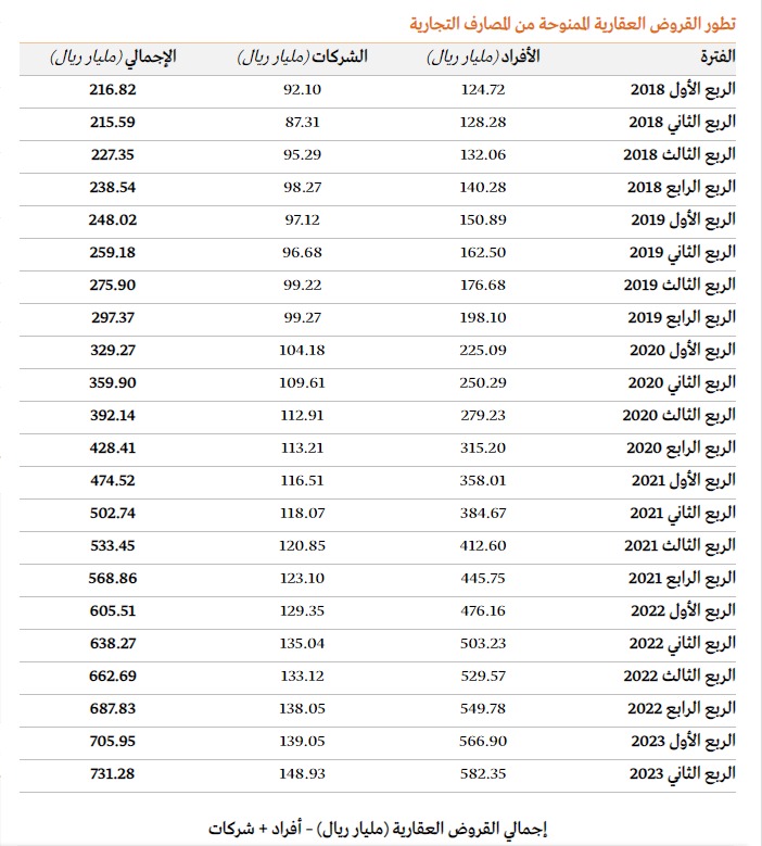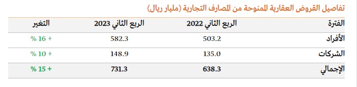ارتفعت القروض العقارية التي منحتها البنوك التجارية في السعودية للأفراد والشركات بنهاية الربع الثاني 2023 بنسبة قدرها 15% لتصل إلى نحو 731.3 مليار ريال، مقارنة بـ638.3 مليار ريال بنهاية الربع الثاني 2022.