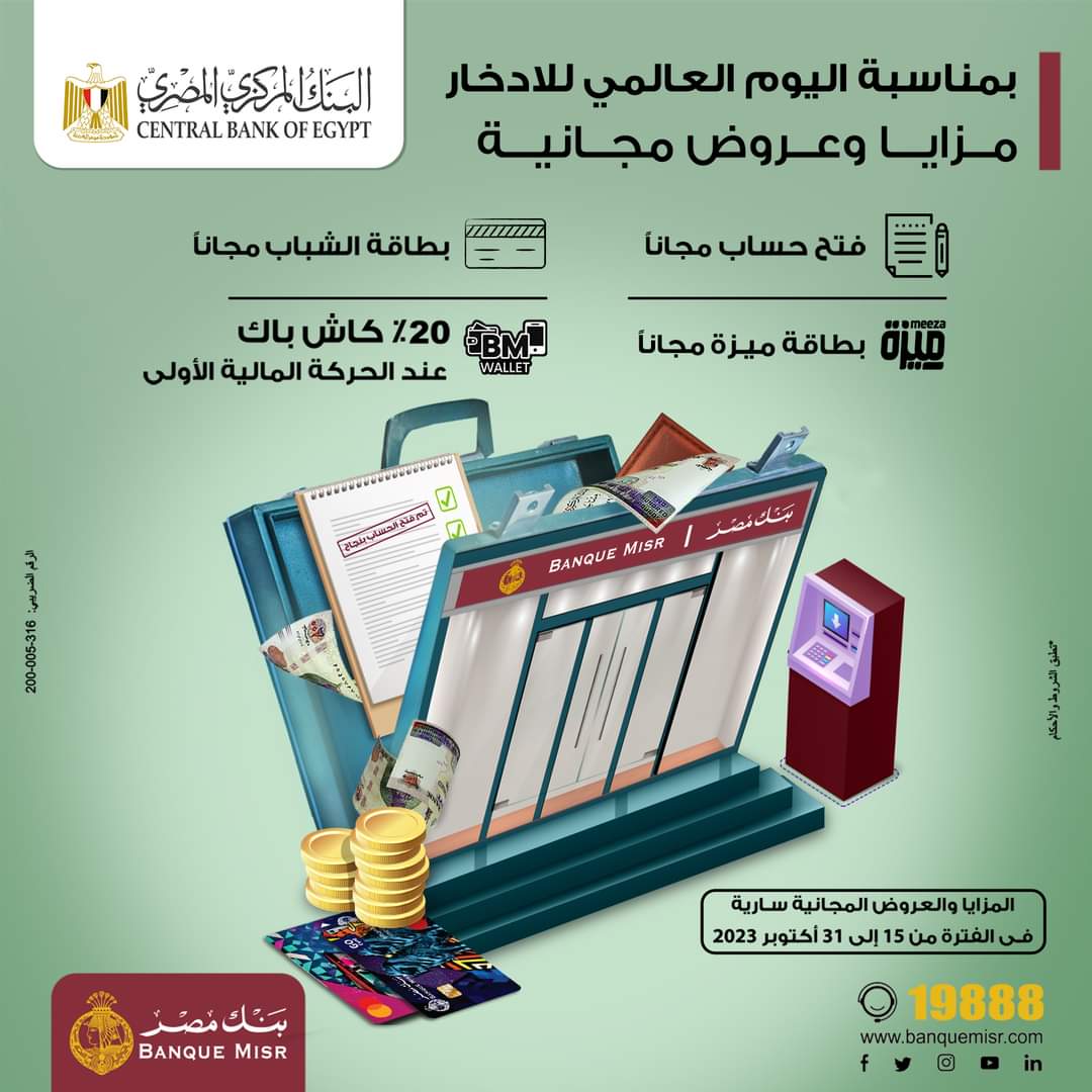 أعلن بنك مصر عن تقديم باقة من المزايا والعروض المجانية في الفترة 15 إلى 31 أكتوبر الحالي بمناسبة اليوم العالمي للدخار.