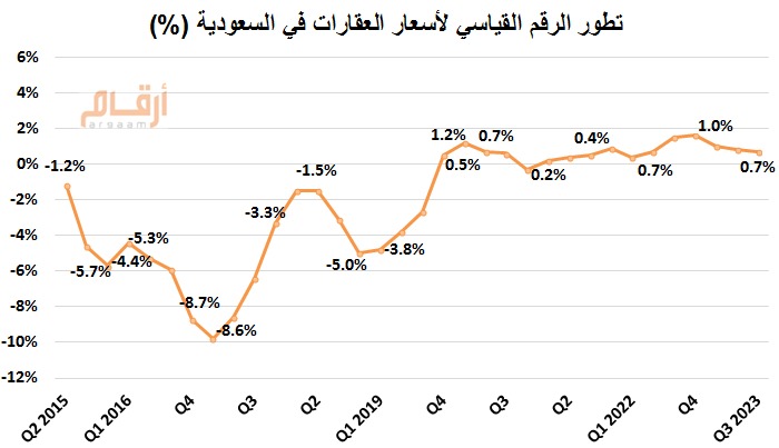 ارتفع الرقم القياسي لأسعار العقارات في المملكة العربية السعودية خلال الربع الثالث من العام الجاري 2023 بنسبة 0.7 % مقارنة بنفس الفترة من العام 2022.