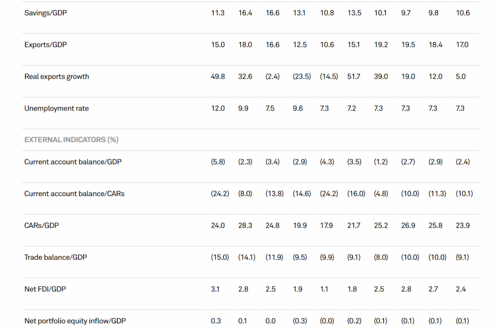 We expect a resolution to the current foreign currency crunch to allow imports to grow and remittances to strengthen over the forecast period to fiscal 2026, resulting in wider current account deficits, which we expect to average 2.7% of GDP. This is lower than the current account deficits in the three years to fiscal 2022, which averaged 3.6% of GDP, because we think increased exchange-rate flexibility and a depreciating currency will constrain imports and support exports.
