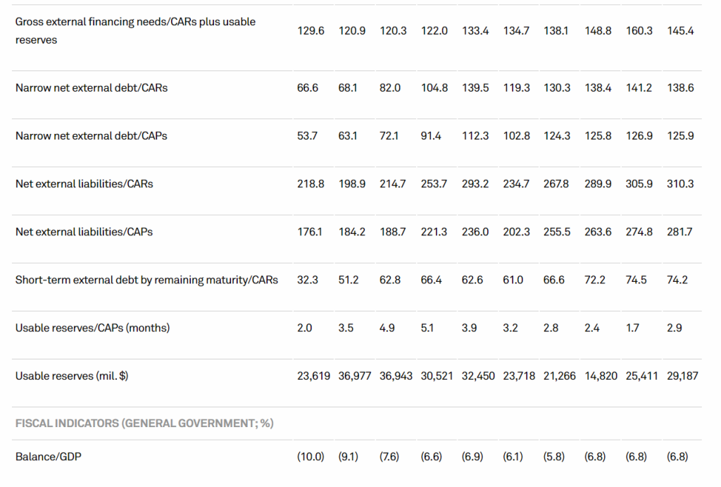 Given the short-term nature of the inflow of GCC deposits in fiscal 2022, our external liquidity metric has deteriorated. We estimate gross external financing needs as a share of CARs and usable reserves of about 150% over the three years through fiscal 2026, and usable reserves covering about 2.4 months of current account payments over the period until fiscal 2026. Our estimate of usable reserves deducts required reserves on resident foreign-currency deposits from officially reported reserves. Given the uncertainty about the level of the EGP, we expect foreign currency deposits, and therefore required reserves, to increase sharply to 40% of total deposits in fiscal 2024, having reached about 20% in fiscal 2023.