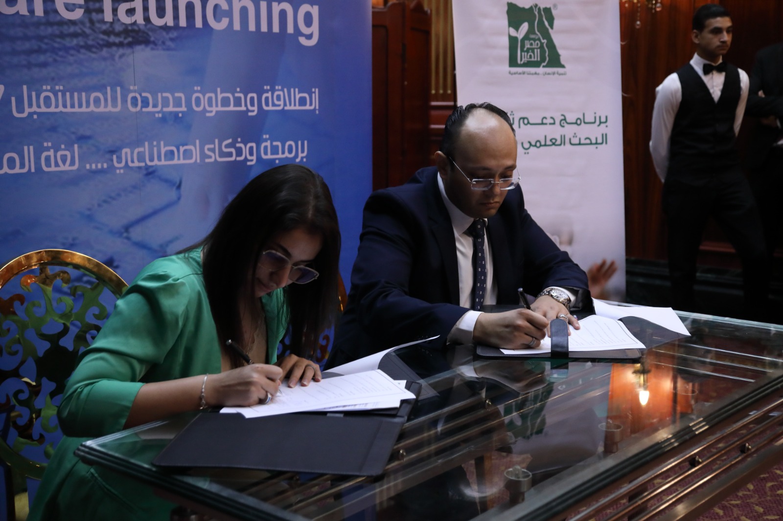 وقع الاتفاقيات محمد عاصم الطماوي رئيس الاكاديمية و الدكتورة نجوي السيد عن مؤسسة مصر الخير ومحمد يحي عضو مجلس إدارة نقابة الصحفيين والدكتورة هايدي أمين مؤسسة سفراء التابعة لوزارة التضامن الاجتماعي