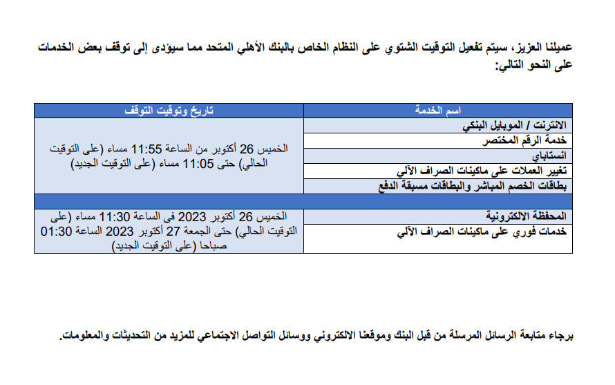 وقالت بنوك في رسائل بعثت بها إلى بنوكها إن الخدمات التي ستتأثر هي، الإنترنت البنكي وخدمات الرقم المختضر وشبكة المدفوعات اللحظية إنستاباي وتغيير العملات من خلال ماكينات الصراف الآلي والمحفظة الإلكترونية وخدمات فوري على ماكينات الصراف الآلي.