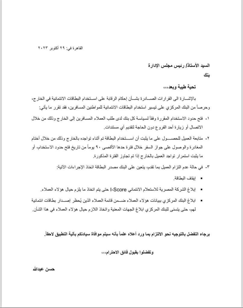 ونوه البنك بأنه في حالة عدم التزام العميل بما تقدم، يتعين على البنك مصدر البطاقة إيقاف البطاقة وإبلاغ الشركة المصرية للاستعلام الائتماني Score- حتى يتم اتخاذ ما يلزم حيال هؤلاء العملاء ابلاغ البنك المركزي ببيانات هؤلاء العملاء ضمن قائمة العملاء الذين يحظر إصدار بطاقات ائتمانية لهم، حتى يتسنى للبنك المركزي ابلاغ الجهات المعنية واتخاذ اللازم حيال هؤلاء العملاء في هذا الشأن.