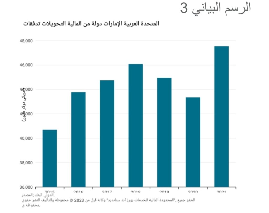 يساهم العدد الكبير من الوافدين في دولة الإمارات، لاسيما العمال ذوي الدخل المنخفض الذين يرسلون الأموال إلى وطنهم الأم، بصورة كبيرة في الطلب على شركات تحويل الأموال ذات التكلفة المنخفضة والسرعة العالية. وفقاً للبنك الدولي، أرسل الوافدون في دولة الإمارات 46.5 مليار دولار أمريكي إلى بلدانهم في عام 2021 (انظر الرسم البياني 3). من وجهة نظرنا، يمكن للبنوك الافتراضية أن تجذب جزءاً من عمليات تحويل الأموال في البنوك الإماراتية ومكاتب الصرافة من خلال خفض رسوم التحويل وتوفير أسعار صرف أفضل وتقليل الفترة الزمنية للتحويل. بالرغم من ذلك، ما تزال مكاتب الصرافة تهيمن على التحويلات المالية وتعالج أكثر من ثلاثة أرباع التحويلات المالية الدولية في دولة الإمارات العربية المتحدة، حيث بلغت 145.7 مليار درهم في عام 2022.