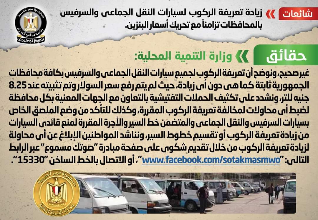 انتشر في بعض المواقع الإلكترونية وصفحات التواصل الاجتماعي أنباء بشأن زيادة تعريفة الركوب لسيارات النقل الجماعي والسرفيس بالمحافظات تزامناً مع تحريك أسعار البنزين، وقد قام المركز الإعلامي لمجلس الوزراء بالتواصل مع وزارة التنمية المحلية، والتي نفت تلك الأنباء، مُؤكدةً أنه لا صحة لزيادة تعريفة الركوب لسيارات النقل الجماعي والسرفيس بالمحافظات تزامناً مع تحريك أسعار البنزين.