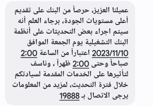 وقال البنك أن عمليات التحدبث ستجري اعتباراً من الساعة 2:00 صباحاً وحتى 2:00 ظهراً ، معربا عن أسفه لتأثير عمليات التحديث على الخدمات المقدمة خلال فترة التحديث.