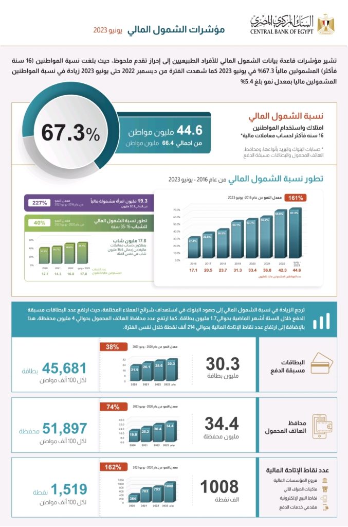 أعلن البنك المركزي المصري تقرير الشمول المالي لشهر يونيو 2023، والذي اظهر نموا بنسبة الشمول المالي إلى 67.3% بنهاية يونيو الماضي وجاءت تفاصيل التقرير كالتالي: