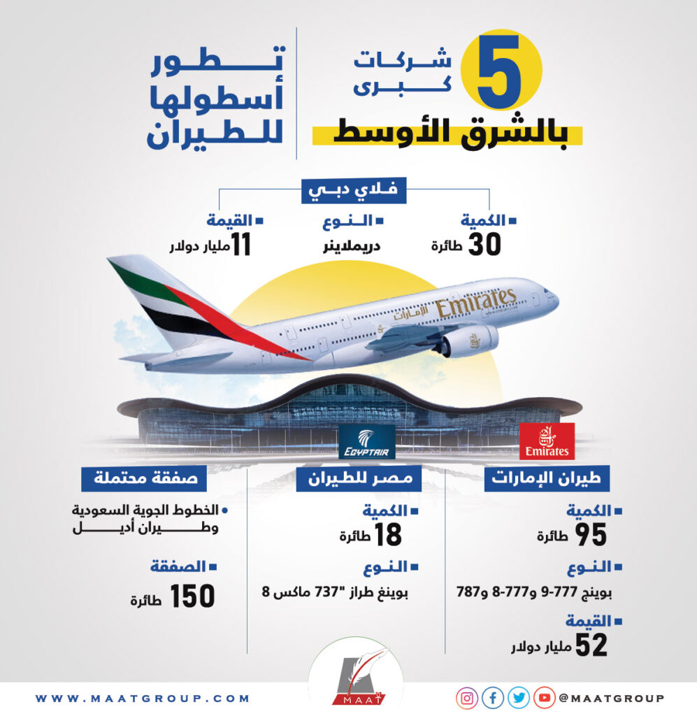 الإنفوجراف أشار إلى شركة فلاي دبي والتي أعلنت عن صفقة مع بوينج الأمريكية تلتزم بموجبها شركة الطيران الاقتصادي بشراء 30 طائرة من طراز 787-9 دريم لاينر عريضة البدن بقيمة إجمالية تصل إلى 11 مليار دولار.