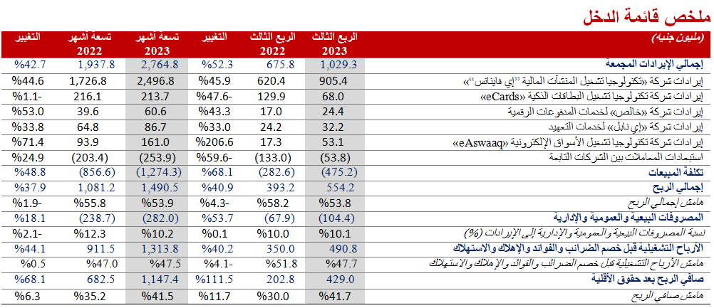 وبعد استبعاد المعاملات بين الشركات التابعة، ارتفعت إيرادات شركة تكنولوجيا تشغيل البطاقات الذكية «e-Cards» بنسبة سنوي 39.2% لتسجّل 162.6 مليون جنيه خلال أول تسعة أشهر من 2023، بفضل ارتفاع إيرادات إدارة البطاقات بمعدّل سنوي 125.7% إلى 117.1 مليون جنيه خلال نفس الفترة. وارتفعت إيرادات شركة «خالص» بمعدل سنوي 34.9% إلى 45.5 مليون جنيه خلال أول تسعة أشهر من 2023، بفضل نمو شبكة نقاط البيع إلى جانب ارتفاع حجم المعاملات خلال الفترة.