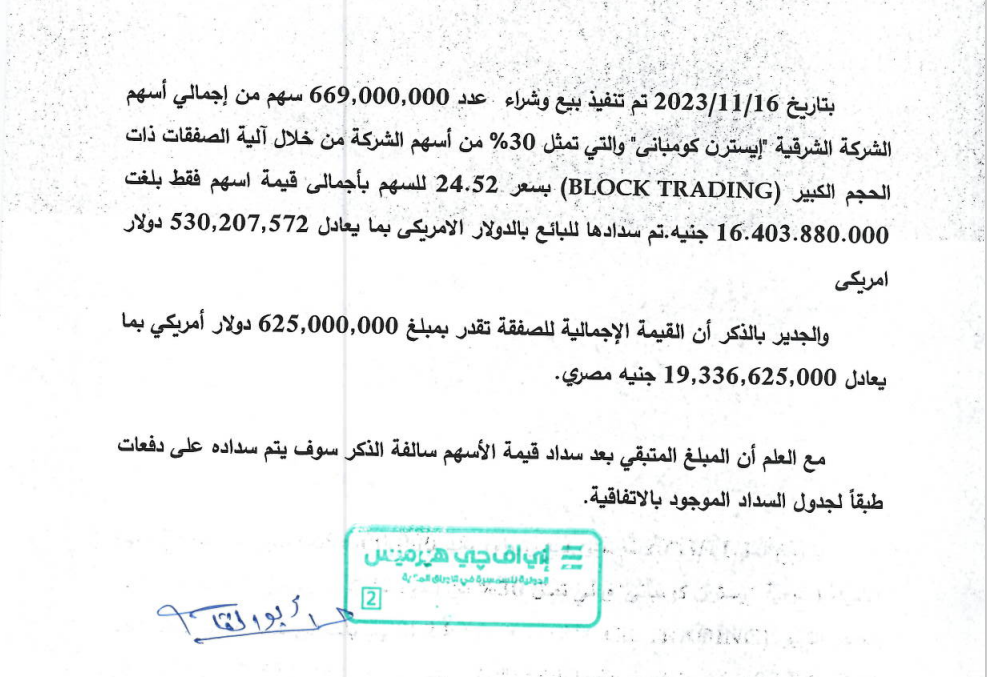 وأضافت أن القيمة قيمة الأسهم في الصفقة بلغت 16.403.880 مليار جنيه، تم سدادها للبائع بالدولار الأمريكي بواقع 530 مليون و207 ألفا و572 دولار أمريكي، موضحة أن القيمة الإجمالية للصفقة تبلغ 625 مليون دولار تعادل 19 مليارا و336 مليونا و625 ألف جنيه.