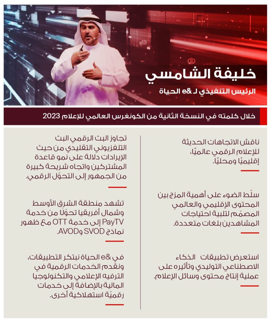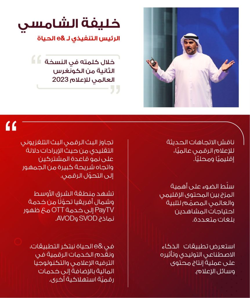قال خليفة الشامسي الرئيس التنفيذي لشركة “&e أي آند الحياة” إن التكنولوجيا تلعب دوراً هاماً وأساسياً في إثراء العديد من القطاعات لا سيما المشهد الإعلامي، وذلك من خلال توظيف أحدث إمكانيات الذكاء الاصطناعي، وشبكة الجيل الخامس، وتحليلات البيانات الخاصة بالمحتوى التي تعزز من تجربة المستخدم وتساعد في تحقيق الشمول في المحتوى المقدم بما يناسب مع مختلف شرائح العملاء.
