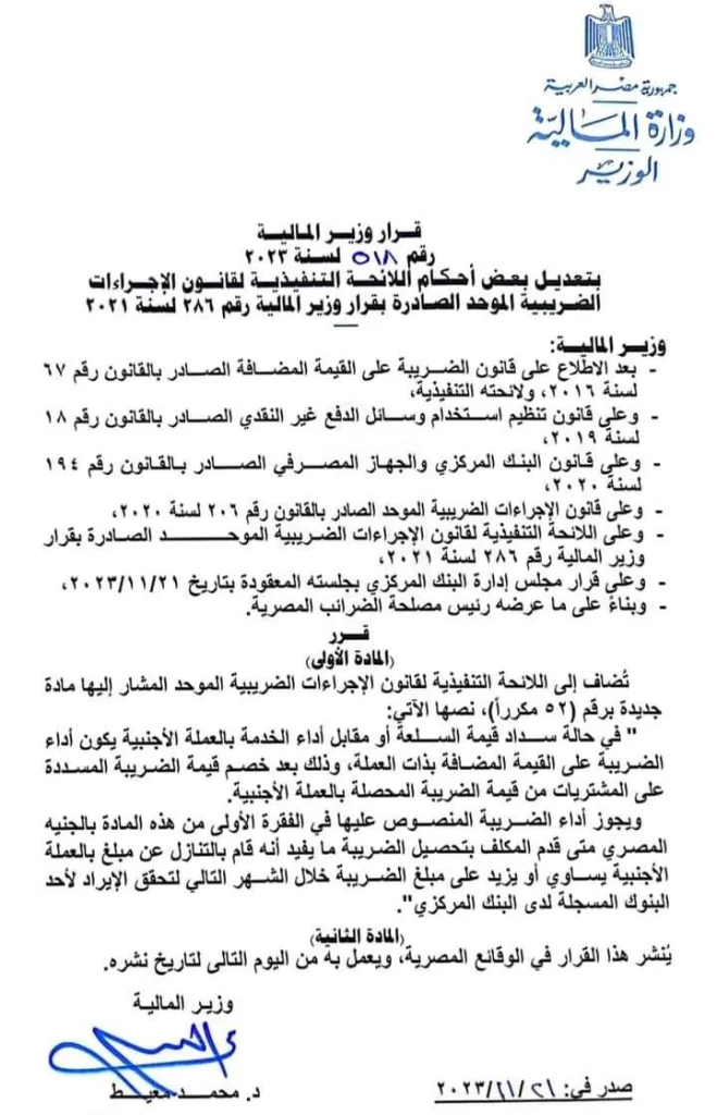 وأضاف وزير المالية مادة جديدة إلى اللائحة التنفيذية لقانون الإجراءات الضريبية الموحد، مادة تلزم مقدم السلعة أو الخدمة التي يتم تحصيل قيمتها بالعملة الأجنبية بتقديم الضريبة المضافة عليها بنفس عملة.