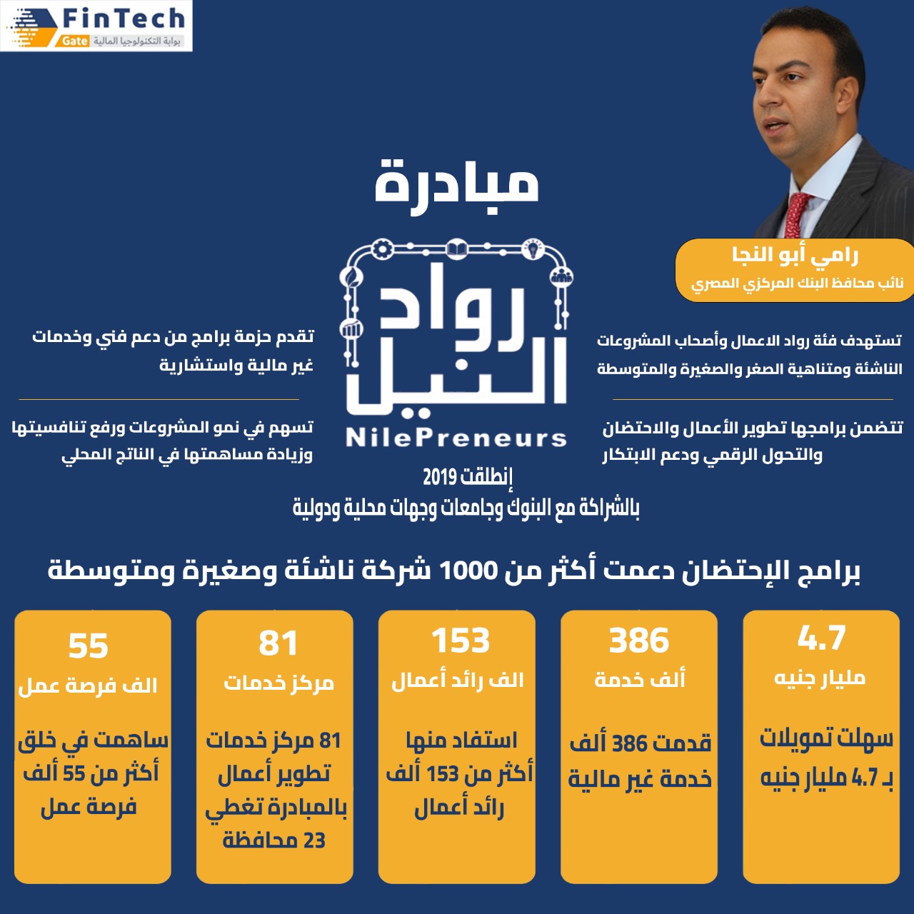 أوضح أن جهود مبادرة «رواد النيل» أسفرت عن تقديم أكثر من 386 ألف خدمة غير مالية واستشارية لأكثر من 153 ألف مستفيد ومشروع وتسهيل منح تمويلات بأكثر من 4.7 مليار جنيه من خلال 81 مركز خدمات تطوير أعمال تغطي 23 محافظة من محافظات الجمهورية.