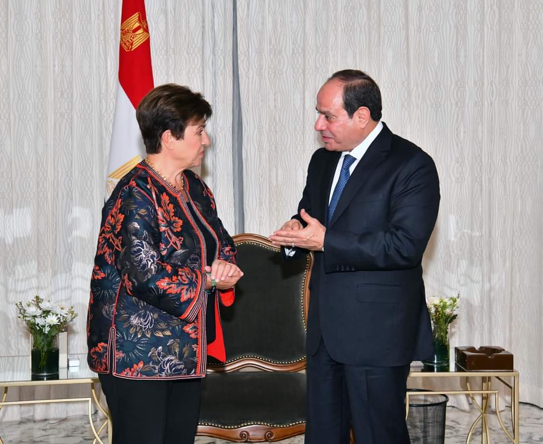 استقبل الرئيس عبد الفتاح السيسي مساء اليوم عقب وصوله إلى دولة الإمارات الشقيقة، للمشاركة في قمة المناخ كوب 28, كريستالينا چورچييڤا، المدير التنفيذي لصندوق النقد الدولي.