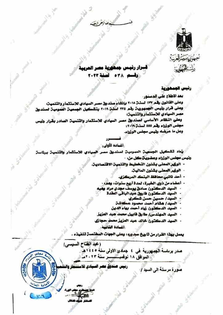 وشمل القرار دخول عدد من الوزراء السابقين، ضمن أعضاء الجمعية العمومية لصندوق مصر السيادي للاستثمار والتنمية، المعاد تشكيله بقرار من رئيس الجمهورية عبد الفتاح السيسي، على أن يتولى رئيس الوزراء مصطفى مدبولي رئيس الوزراء، رئاسة مجلس الصندوق.