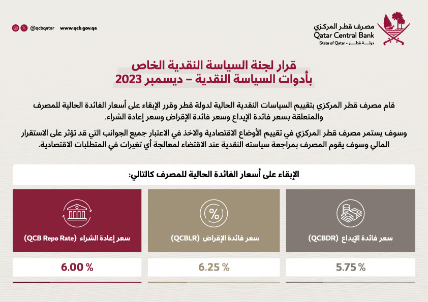 من جهته.. قرر مصرف قطر المركزي الابقاء على اسعار الفائدة عند مستوياتها البالغة 5.75% على الايداع و6.25% على الاقراض و6% على اعادة الشراء.