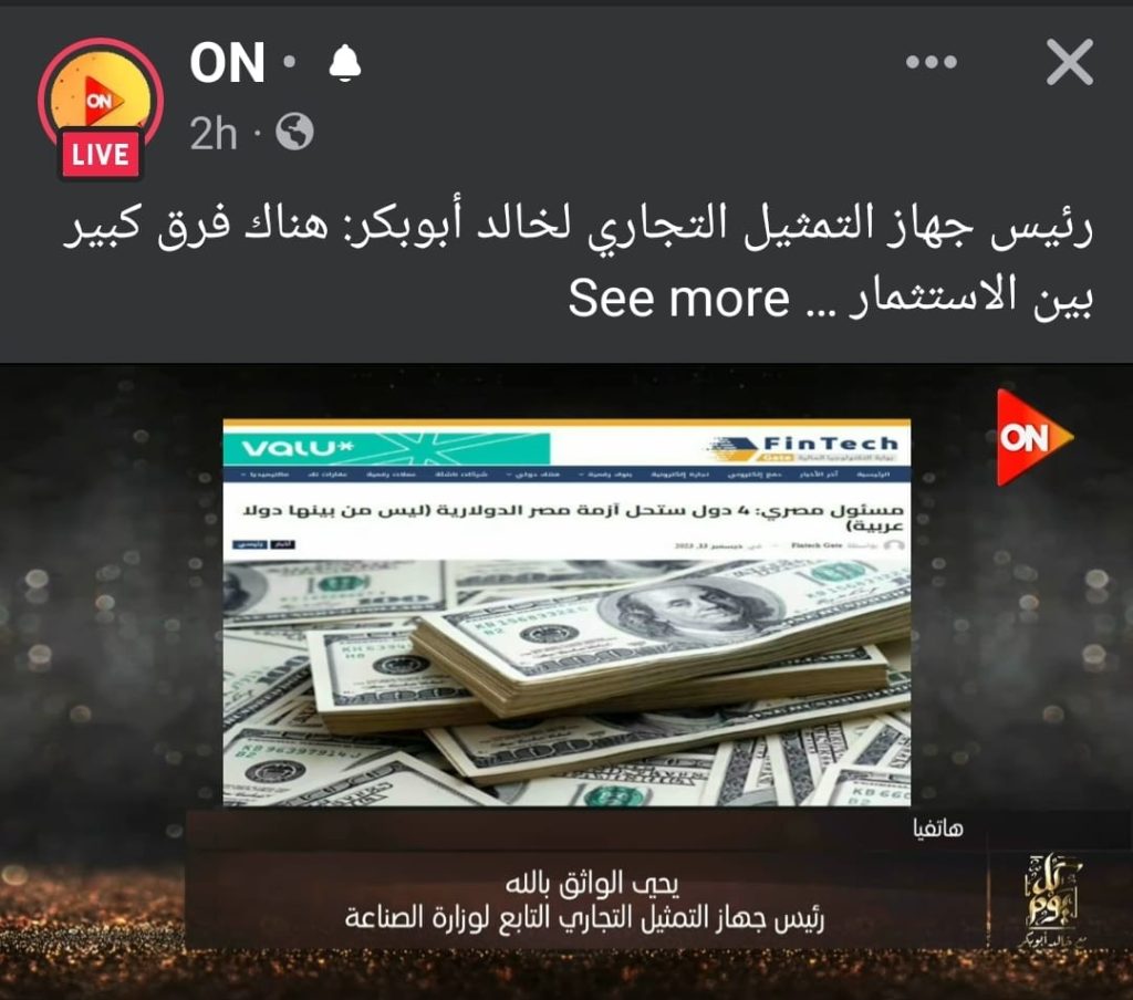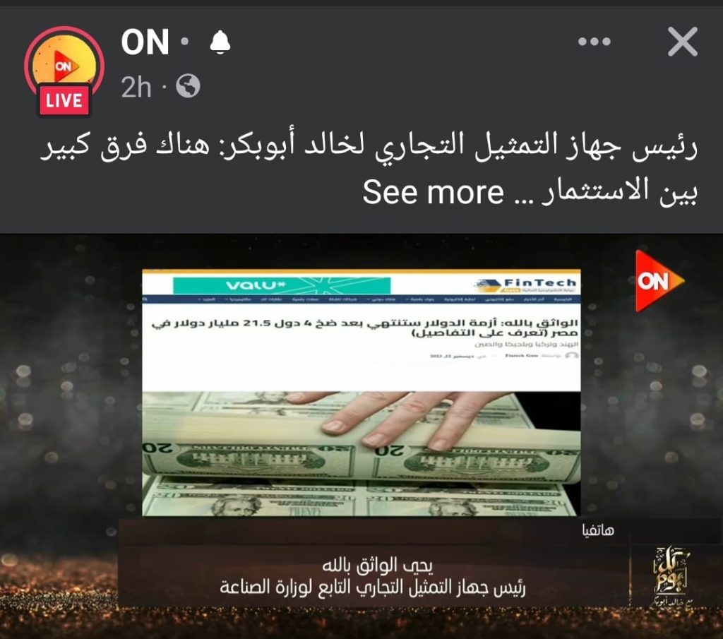 وقال الواثق بالله في تصريحات لبرنامج «كل يوم» مع الأستاذ خالد أبو بكر والمذاع على قناة «ON» أنه أثناء حضوره yحدى الندوات على هامش معرض فود أفريقيا أدلى بتصريحات تضمنت طرح أمثلة على ما يشهده الاقتصاد المصري من استثمارات أجنبيه ستساهم في تخفيف حدة الطلب على الدولار خلال العام المقبل 2024.