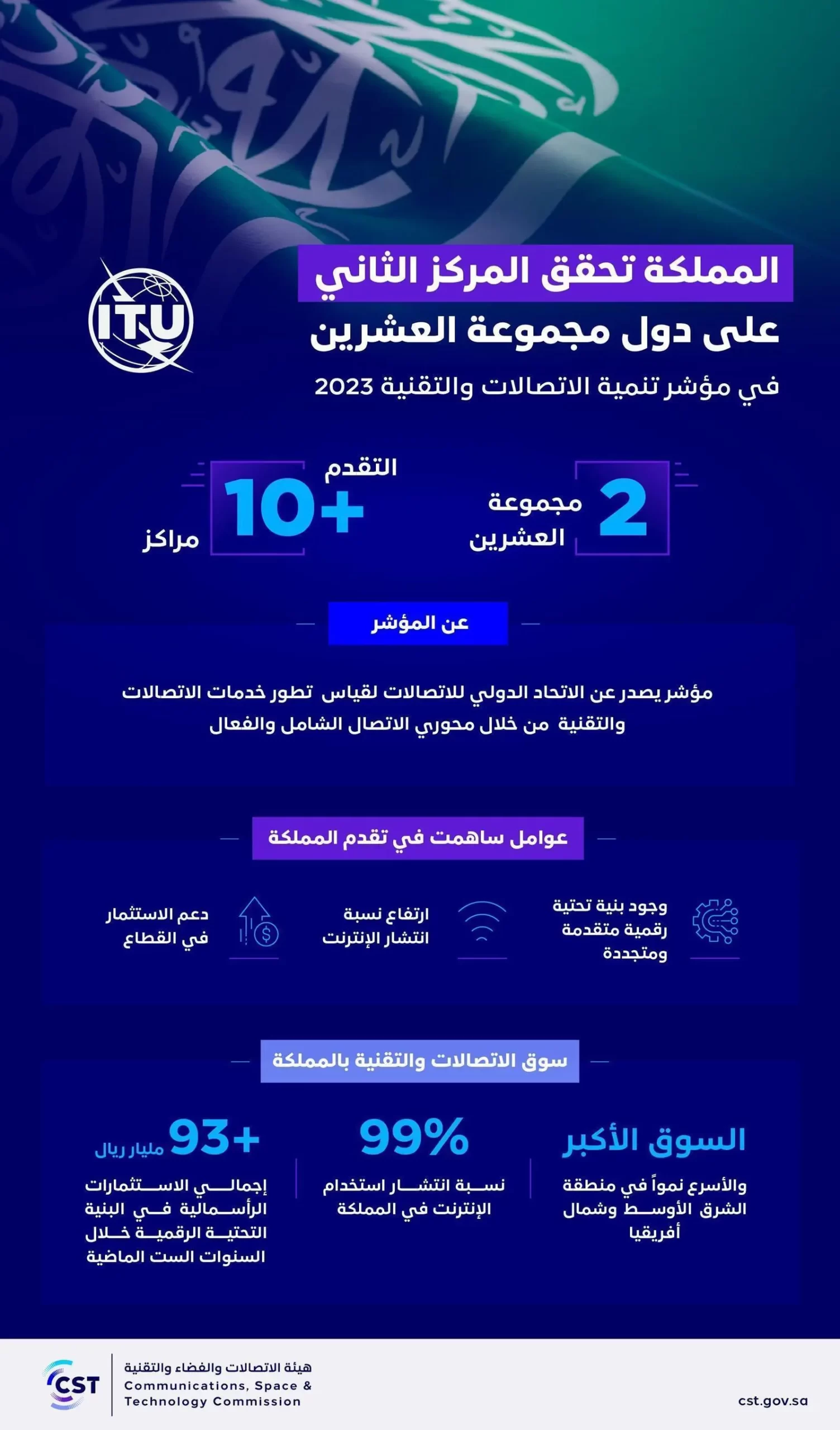 أعلن الاتحاد الدولي للاتصالات (ITU) عن تحقيق المملكة المركز الثاني على دول مجموعة العشرين، في مؤشر تنمية الاتصالات والتقنية (IDI) 2023، مسجلة المملكة بذلك تقدمها 10 مراكز على دول مجموعة العشرين في المؤشر الذي يرصد اقتصادات 169 دولة، لقياس تقدمها في خدمات الاتصالات والتقنية من خلال عدد من المؤشرات الفرعية المقسمة على محوري الاتصال الشامل والفعال، وذلك بهدف قياس تحقيق معايير قوة البنية التحتية وتوفير اتصال آمن وفعال للجميع.