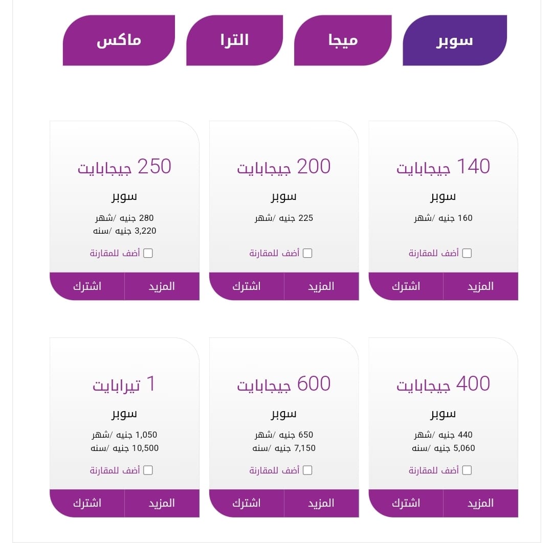 - وباقة 1 تيرابايت بسعر 1050 جنيها بدلا من 800 جنيه، وهذه الأسعار لا تشمل الضريبة.