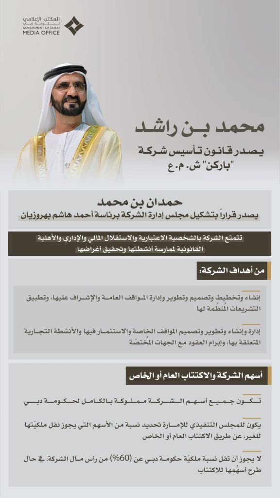 أصدر الشيخ محمد بن راشد آل مكتوم، نائب رئيس الدولة رئيس مجلس الوزراء الإماراتي بصفته حاكماً لإمارة دبي، قانون تأسيس شركة «باركن» رقم (30) لسنة 2023، والذي نصّ على أنها شركة مساهمة عامة، تتمتع بالشخصية الاعتبارية، والاستقلال المالي والإداري، والأهلية القانونية لممارسة أنشطتها وتحقيق أغراضها، وفقاً لأحكام قانون إنشائها ونظامها الأساسي والتشريعات السارية في إمارة دبي.