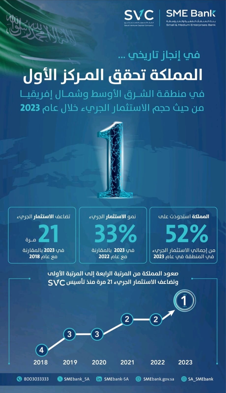 وشهدت منظومة الاستثمار الجريء في المملكة تضاعُف إجمالي المبالغ المستثمرة في الشركات الناشئة 21 مرة في 2023م بالمقارنة مع عام 2018م , الذي تأسست وانطلقت فيه أعمال SVC.