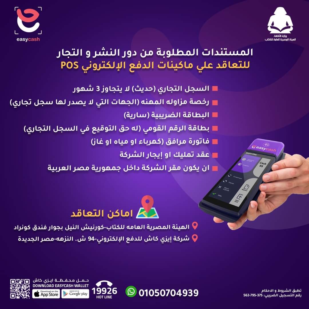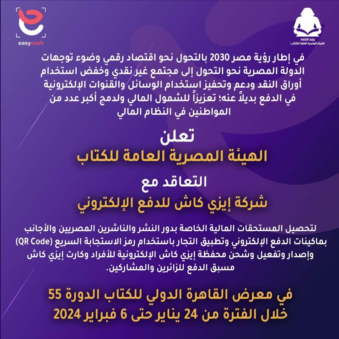 أعلنت الهيئة المصرية العامة للكتاب التعاقد مع شركة إيزي كاش للدفع الإلكتروني لتحصيل المستحقات المالية الخاصة بدور النشر، والناشرين المصريين والأجانب بماكينات الدفع الإلكتروني وتطبيق التجار باستخدام رمز الاستجابة السريع (QR Code)، في معرض القاهرة الدولي للكتاب الدورة 55 المقام خلال الفترة من 24 يناير حتى 6 فبراير 2024.