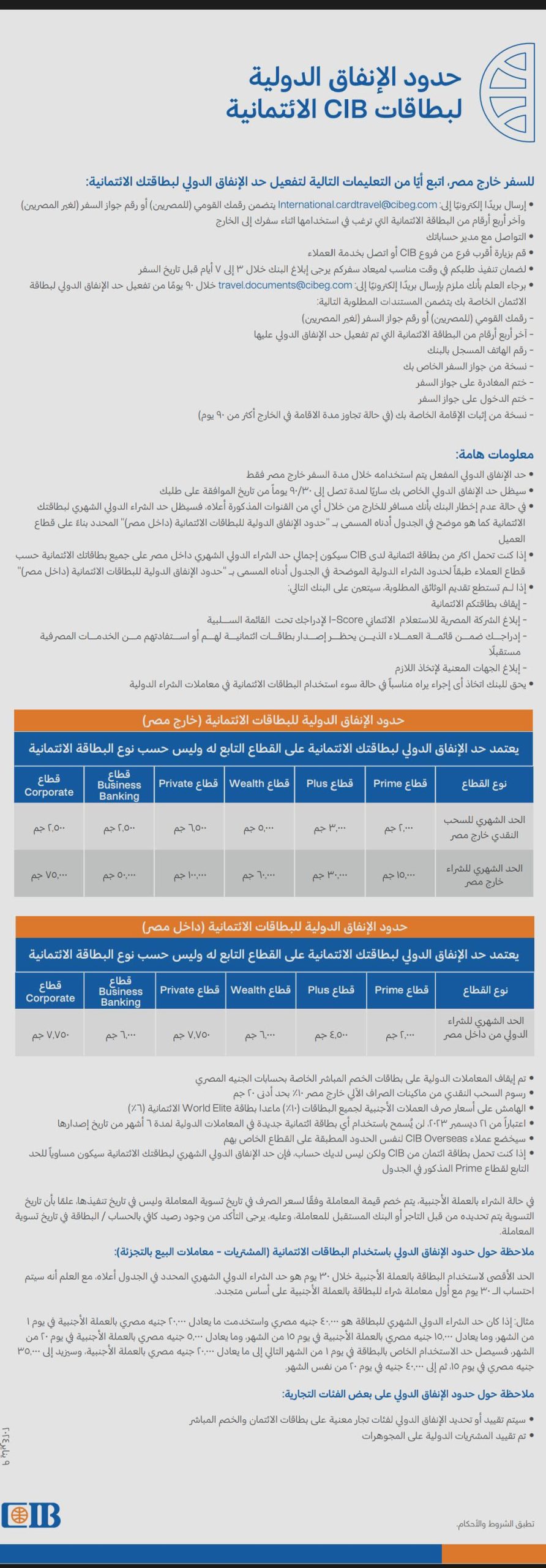 أعلن البنك التجاري الدولي مصر CIB عن تغيير حدود الإنفاق الدولية على بطاقات CIB الائتمانية عند السفر للخارج.