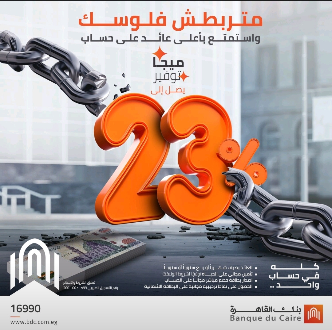 أعلن بنك القاهرة طرح حساب توفير بعائد يصل إلى 23%، ويطلق عليه اسم حساب ميجا توفير، واعتبر البنك أن الحساب لا يقيد الأموال كما هو الحال في الشهادات، تحت عنوان «متربطش فلوسك»، على حد وصفه، وأنه أعلى عائد.