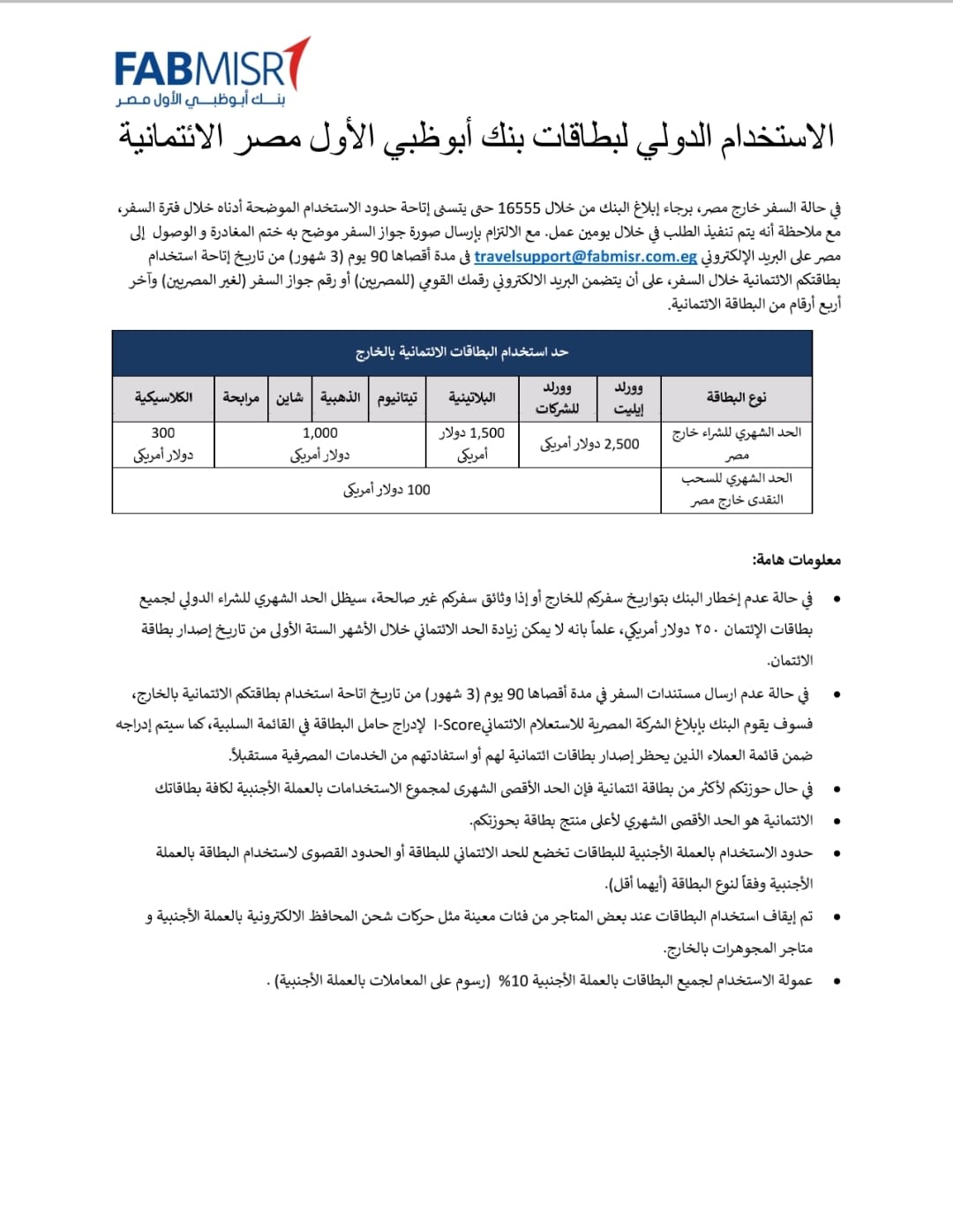 كما أعلن البنك عن تعديل حدود الاستخدام الدولي لبطاقات بنك أبوظبي الأول مصر الائتمانية، وذلك في حالة السفر خارج مصر، حيث طالب البنك بضرورة إبلاغ البنك من خلال 16555 حتى يتسنى إتاحة حدود الاستخدام الموضحة أدناه خلال فترة السفر مع ملاحظة أنه يتم تنفيذ الطلب في خلال يومين عمل مع الالتزام بإرسال صورة جواز السفر موضح به ختم المغادرة والوصول إلى مصر على البريد الإلكتروني travelsupport@fabmisr.com.eg في مدة أقصاها 90 يوم (3) شهور) من تاريخ إتاحة استخدام بطاقتكم الائتمانية خلال السفر، على أن يتضمن البريد الالكتروني رقمك القومي للمصريين) أو رقم جواز السفر (لغير المصريين) وآخر أربع أرقام من البطاقة الائتمانية.