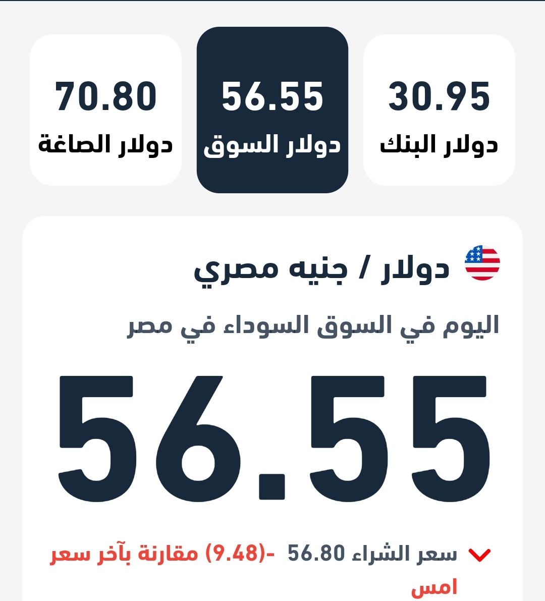 وقال متعاملون في سوق العملات في تصريحات لبوابة فنتيك جيت FinTech Gate إن الأسعار هبطت اليوم إلى 56 جنيها مقابل 73 جنيها الأسبوع الماضي.