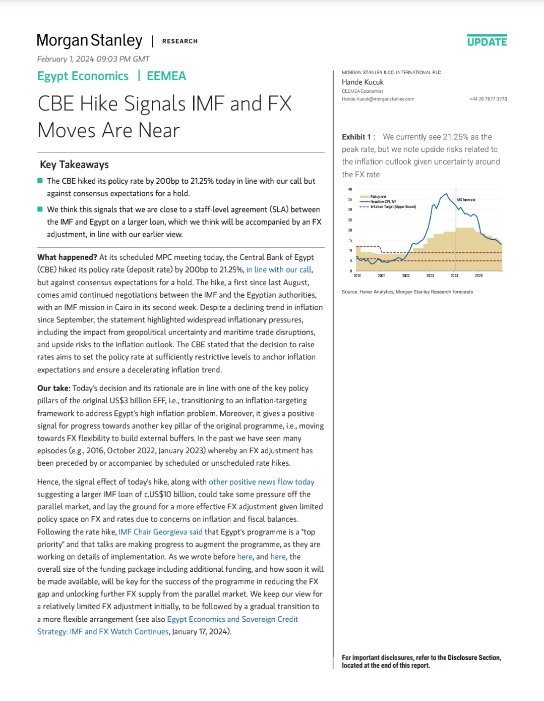 قالت مؤسسة مورجان ستانلي إن تحريك الجنيه المصري بات قريبا بعد قيام البنك المركزي المصري برفع الفائدة بنسبة 2% وقرب الاتفاق النهائي مع صندوق النقد الدولي بشأن زيادة الحزمة التمويلية.